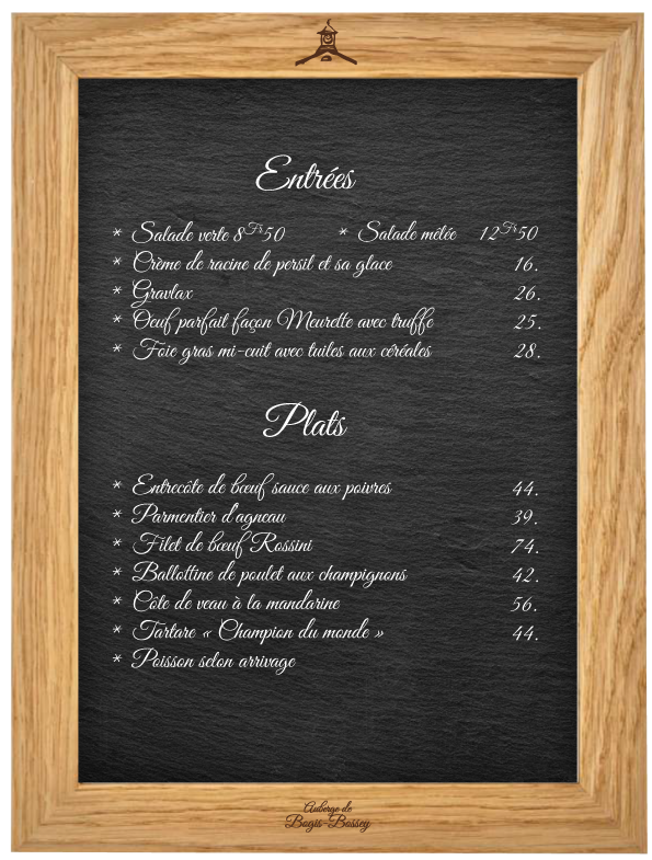 Au restaurant gastronomique, le chef vous propose un menu surprise composé de 3 entrées, plat, et dessert pour CHF 159.– avec possibilité d’inclure en supplément notre chariot de fromages.