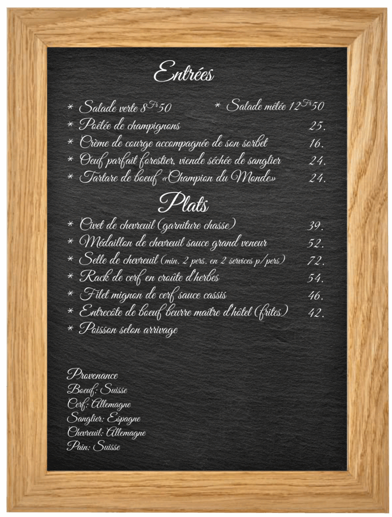 Au restaurant gastronomique, le chef vous propose un menu surprise composé de 3 entrées, plat, et dessert pour CHF 159.– avec possibilité d’inclure en supplément notre chariot de fromages.